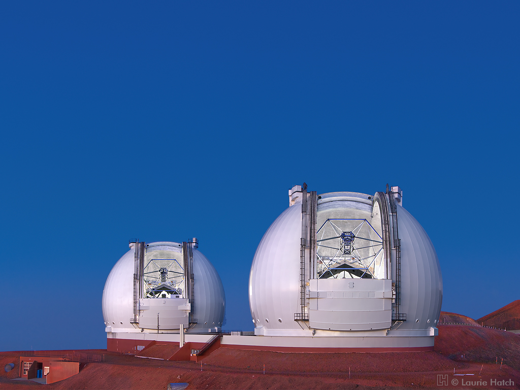 Left: The twin telescopes viewed from the Subaru telescope at the top of Maunu Kea, Hawaii.