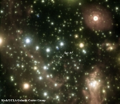 Three HKL-band color mosaic of the central 10” x 10” galactic center region. Color Scheme: H(1.8 microns) = Blue, K' (2.2 microns) = Green, L'(3.8 microns) = Red. Taken with the Laser Guide Star Adaptive Optics System at the W. M. Keck Observatory.