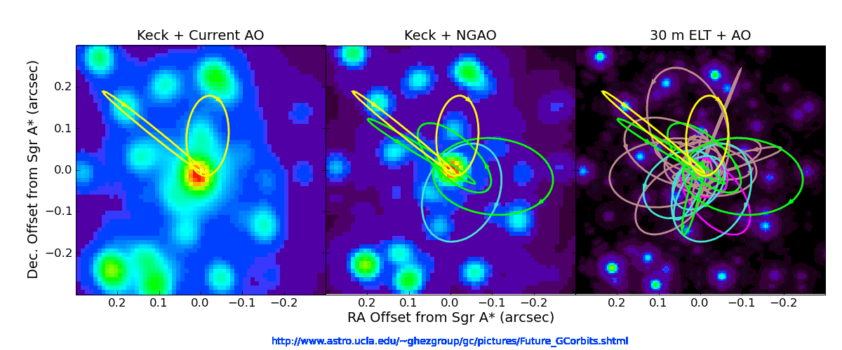 Still image of animation showing the power of the future 30 m Extremely Large Telescopes. Animation showing the improvement in resolution in the central 0.5” of the Galaxy from seeing-limited to Keck + Adaptive Optics to future Extremely Large Telescopes + Adaptive Optics. Actual orbits are shown in the seeing-limited and Keck cases, while additional simulated orbits are included for the ELT case. A movie can be viewed on the Animations Page.